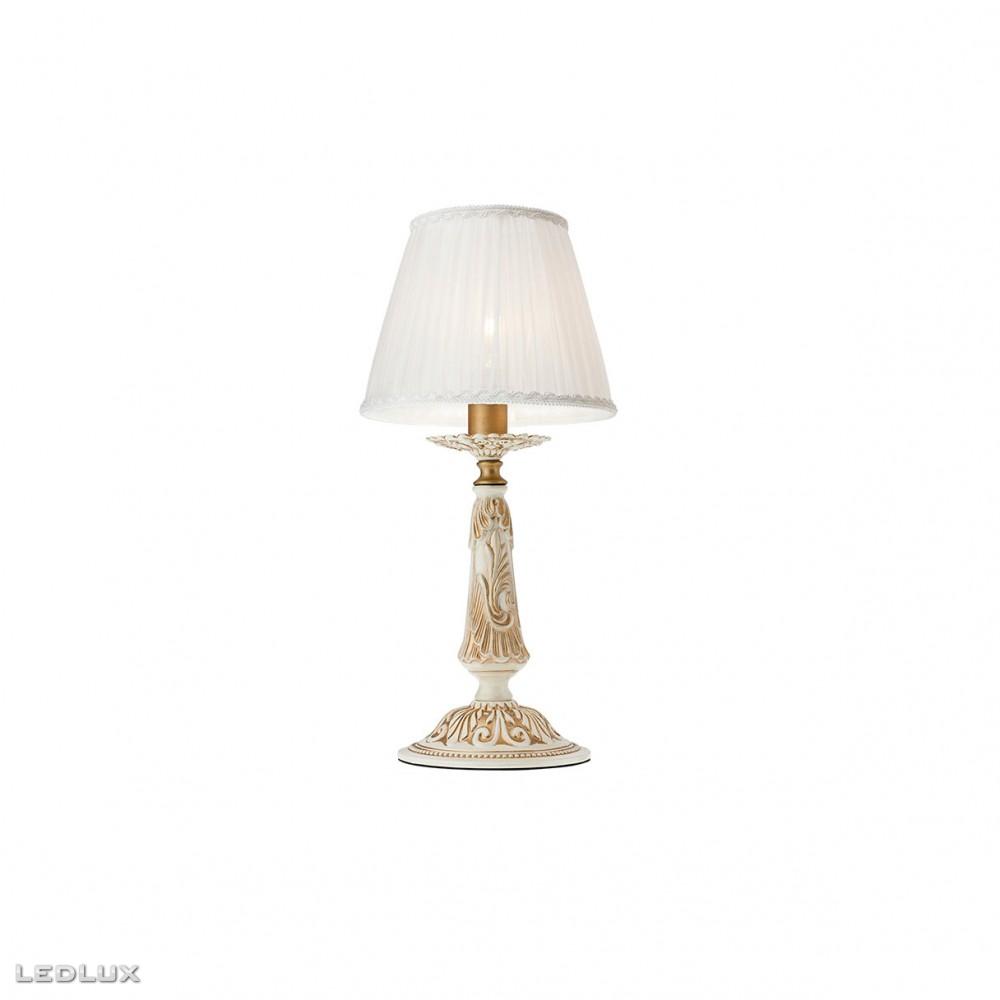 Kovová štruktúra v lesklej farbe, s mosadzou a dekoratívnymi prvkami slonovinovej živice s hnedou patinou. Béžové šifónové tienidlo lemované čipkou.